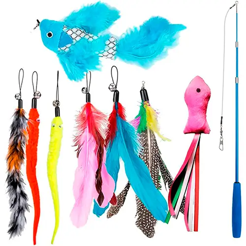 • Incluye 10 muñecos y plumas diferentes, que se pueden cambiar fácilmente gracias a un sistema de clip. Entre ellos, hay peces, ratones, campanas, bolas y pompones de colores.